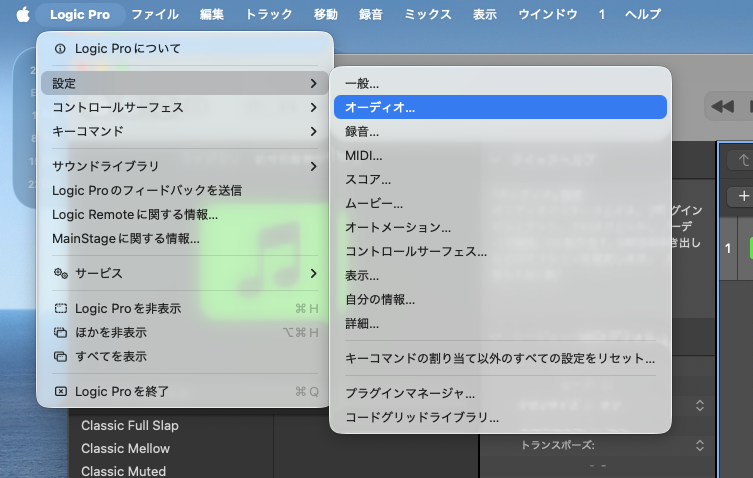 画面左上の「Logic Pro」メニューから「設定」「オーディオ」と進み、デバイスの項目を確認してください。